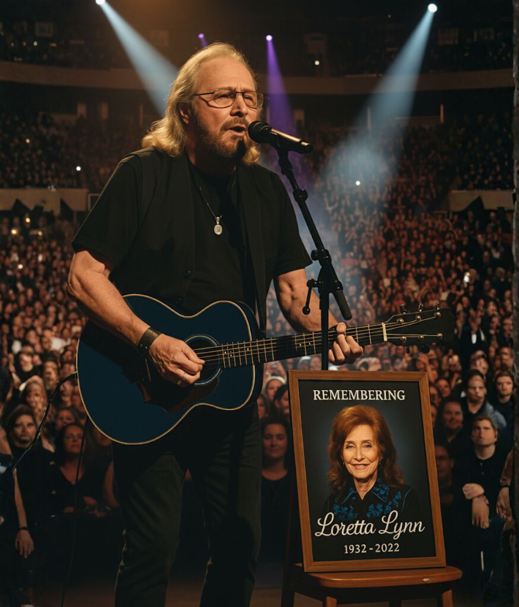 The lights dimmed, and an expectant hush rippled across the vast crowd. When Barry Gibb stepped into the soft glow of the stage, the audience could feel that something rare — something deeply human — was about to unfold. This was not a concert. It was a vigil of love and remembrance, a night to honor Loretta Lynn, the indomitable Coal Miner’s Daughter who had sung the truth of life, heartache, and hope for generations.
